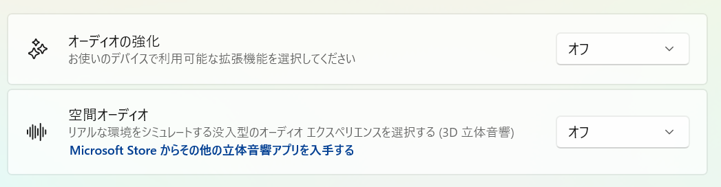 Windows11で追加された「オーディオの補正」または「オーディオの強化」という設定項目が原因です。 この設定項目が設定上の表示ではオフになっているのに内部的にはオンになっている場合があります。